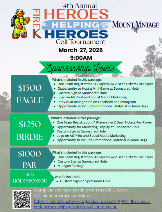 Local business sponsorships are tax deductible and a great opportunity to advertise. FireK marketing and events has a growing reach, to include the FireK runners, golfers, and volunteers. Your support will be seen by all of these populations, as well as much of the fire service community within the CSRA and beyond. We also accept in-kind donations of a product or service if your company is unable to become a sponsor at this time. Contact Mie Lucas at email: Mie@firekfivek.com for more information.
